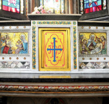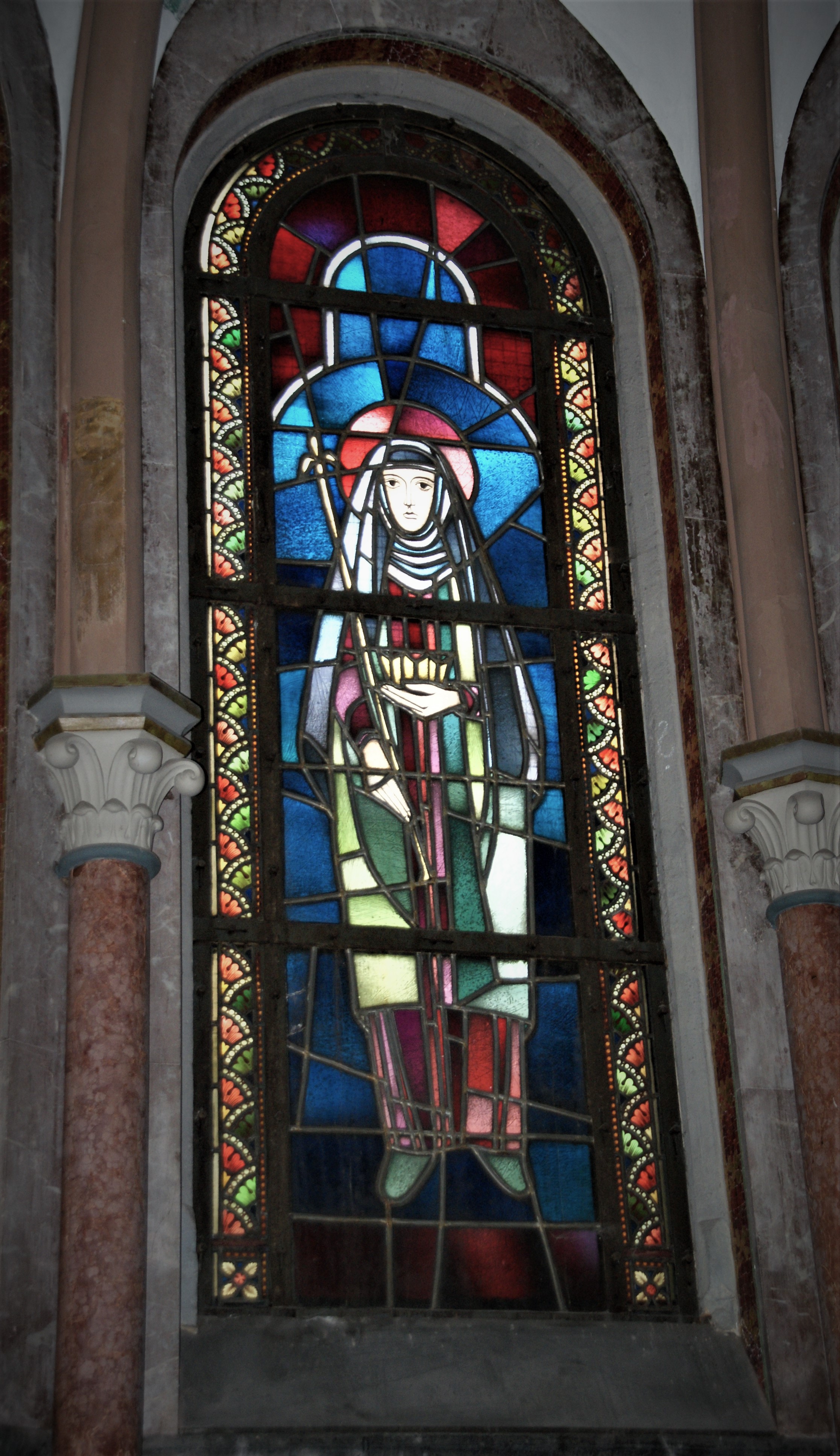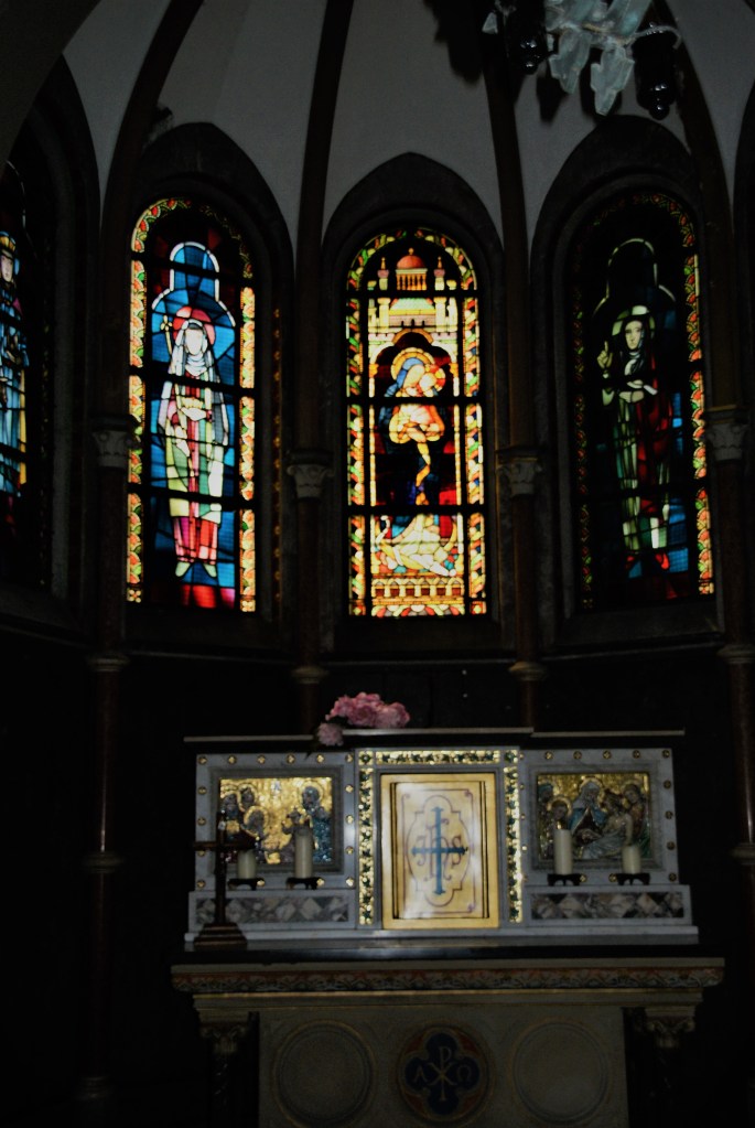 Nur ein Katzensprung von seinem spätklassizistischen Lantz`scher Herrenhaus entfernt, konnte er immer auf das von ihm erschaffene Andenken blicken. Ging er direkt hinüber und durchschritt die Eingangstür, stand Heinrich Lantz wie heute der Besucher direkt vor dem Altar. Was mag ihm zuerst ins Auge gefallen sein? Vielleicht schaute er zuerst auf den mit Heiligen- Mosaiken verzierten Rundbogen über der Apsis. Oder auf die bunten Kirchenfenster mit ihren biblischen Geschichten? Oder waren es eher die durchbrechenden Sonnenstrahlen in dem bunten Glas, die ihre irisierenden Lichtspiele auf die gegenüberliegenden Wände malten, die ihn faszinierten? Der Blick weiter zu dem mittlerweile liebevoll restaurierten Mosaikbild des hl. Paulus? Der hl. Elisabeth? Oder sah er zuerst das in blau- rotes Licht gesprenkeltes schlichte Holzkreuz auf dem Altar?