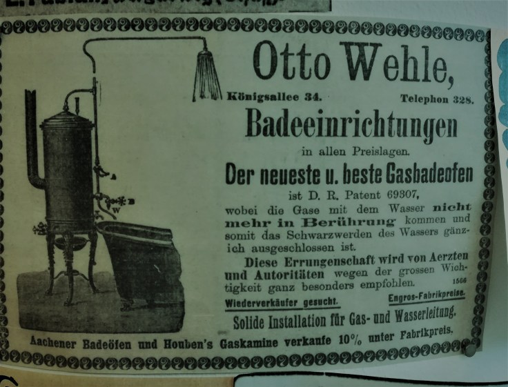 Die Bessergestellten gingen nicht in ein Gemeinschaftsbad, sondern genossen ein voll ausgestattetes Bad mit Waschbecken, Wanne, Lokus, während sie die kunstvoll designten Armaturen aufdrehten, aus denen dank des Gasbadeofens warmes Wasser in die Wanne floss.