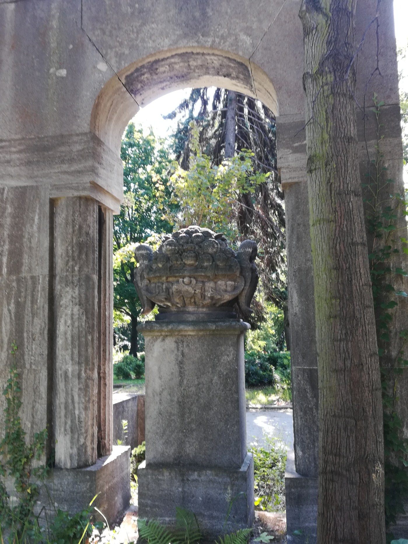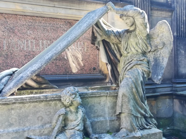 So heißt es an einer Stelle von Johannes Oerdings Lied „Alles Okay“. Und ich könnte schwören, dass er dabei an diesen Gottesacker dachte.. Hier ein mit Unkraut übersätes Mausoleum, dort ein zerbrochenes Postament. Auf der anderen Seite ein mit Flechten überzogener steinerner Engel, der den Deckel des steinernen Sargs festhält. Die Wandgräber, die sich an einer mit Graffiti überzogenen Häuserzeile kleben. Dazwischen wuseln leuchtend rote Eichhörnchen zwischen Grab, Steinen, Bäumen und meinen Füßen hin und her. Schamlos nutzen sie den Heimvorteil aus und versuchen mit überrumpeltem Charme, von dem Besucher Nüsse zu erbetteln.