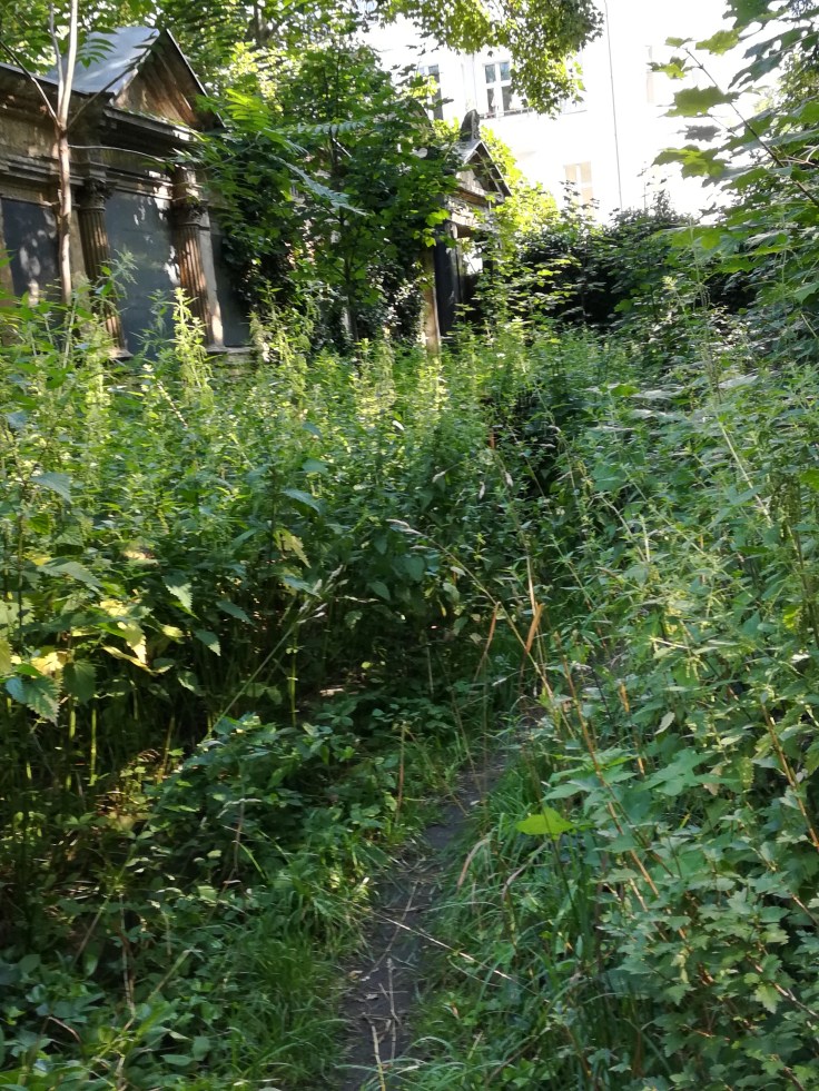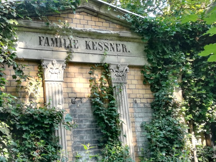 Vor sage und schreibe 117 Jahren eingeweiht, vor dem damaligen Königstor und angelegt auf dem ehemaligen Weinberggelände, gilt der bewährte Gottesacker als Kleinod. Oder um über das Leben und seine Endlichkeit zu sinnieren, die Ohren vor dem Großstadtlärm zu verstopfen. Oder aber auch, um den Geruch Erde, Wildblumen und Rosen wahrzunehmen, deren Duft schwer in der sommerlichen Luft hängt. Bei mir kam auch hinzu, dass ich das kühle Grün der Bäume erfrischender fand, als den kochenden Asphalt Richtung Alexander Platz. Purer Zufall trieb mich zwischen den mit Brennnessel überwucherten Gräber in Richtung Kapelle , ließ mich über eine Baumwurzel stolpern, die einen bemoosten Grabstein zur Seite gesprengt hatte.