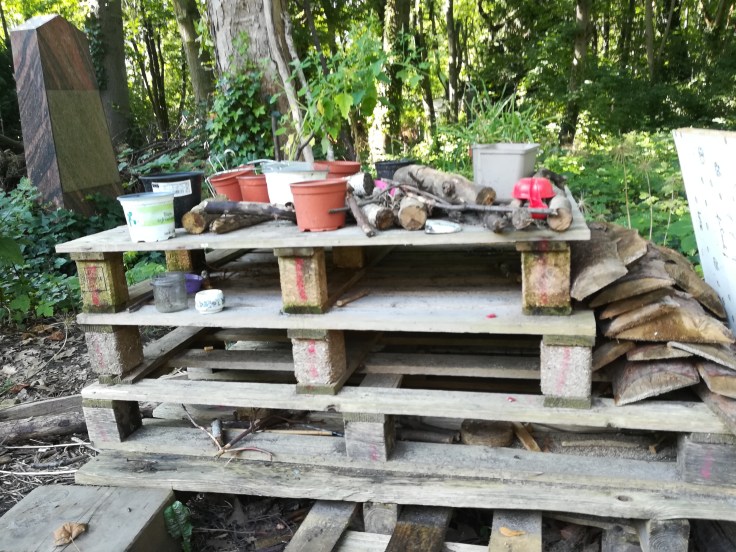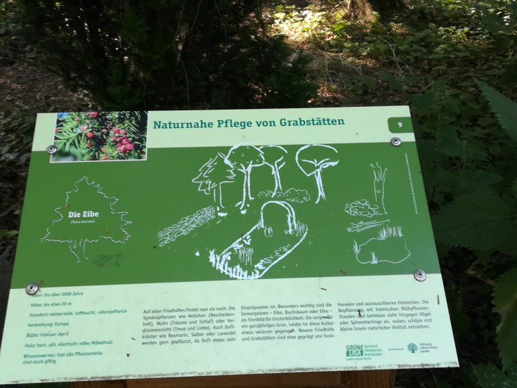 Und ich entdecke noch etwas anderes. Ein Trampelpfad, wie Kinder ihn anlegen, macht mich neugierig. Wohin mag er führen? Mit erhobenen Armen schlängele ich mich an den Brennnesseln vorbei. Zu meinem Erstaunen endet der Weg an einer Kolonie aus liebevoll angelegten Hochbeeten aus Tomaten, Gurken und Zucchini. Ein Spalier Erbsen rang an der Friedhofsmauer hervor. Schilder informieren über den Lebensraum Baum, Unkraut, Wildgemüse und Heilkräuter. Mittendrin laden würfelförmige Gedenksteine als Sitzgelegenheit zur Pause ein. Es gibt jede Menge jede Menge Hobbygärtner in dem Kiez, die dem Aufruf „Tomate sucht Gießkanne“ gefolgt sind. Im diskreten Abstand zu den Gräbern habe sie eine Art Schrebergarten in Hobbit-Format angelegt. Mit dem Vorteil, dass keine Rasenmäher und Grillorgien die Abgeschiedenheit stören.