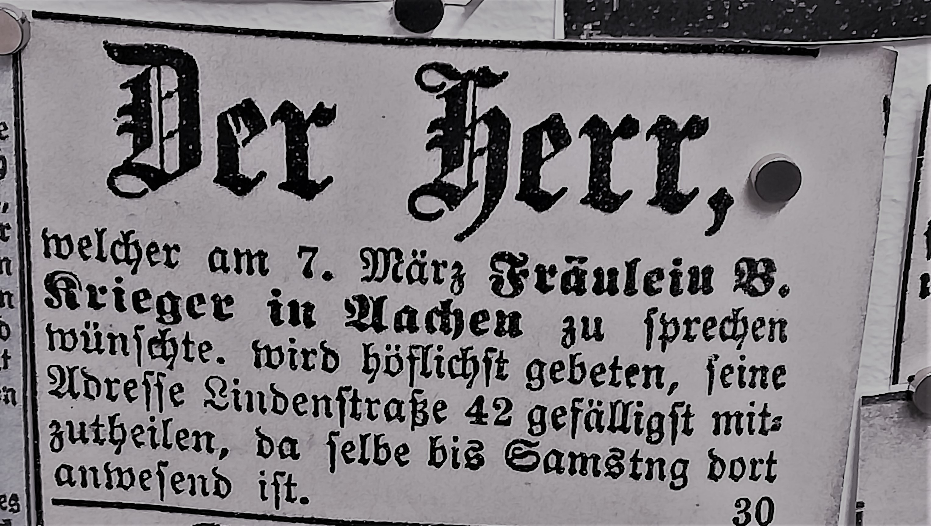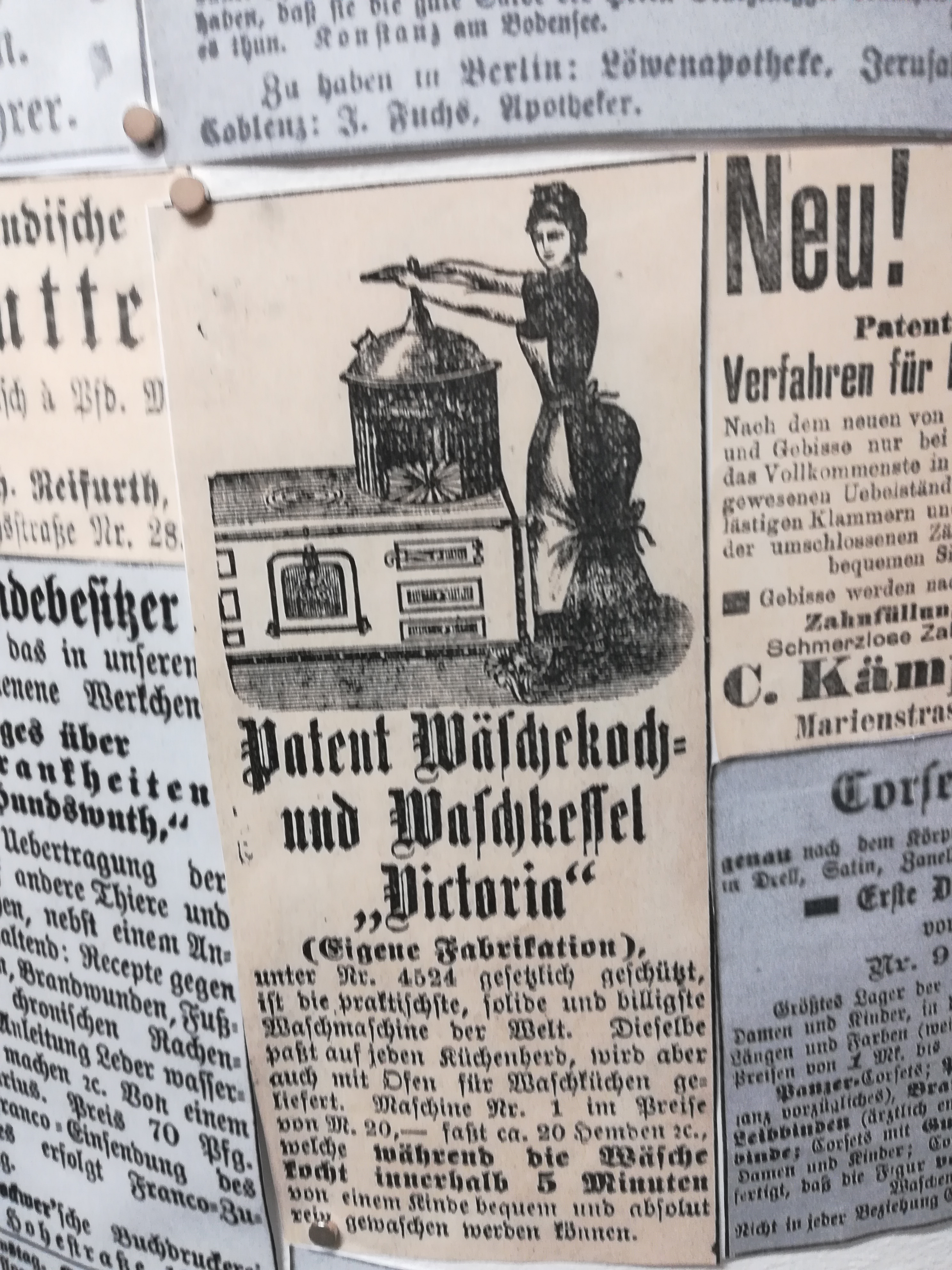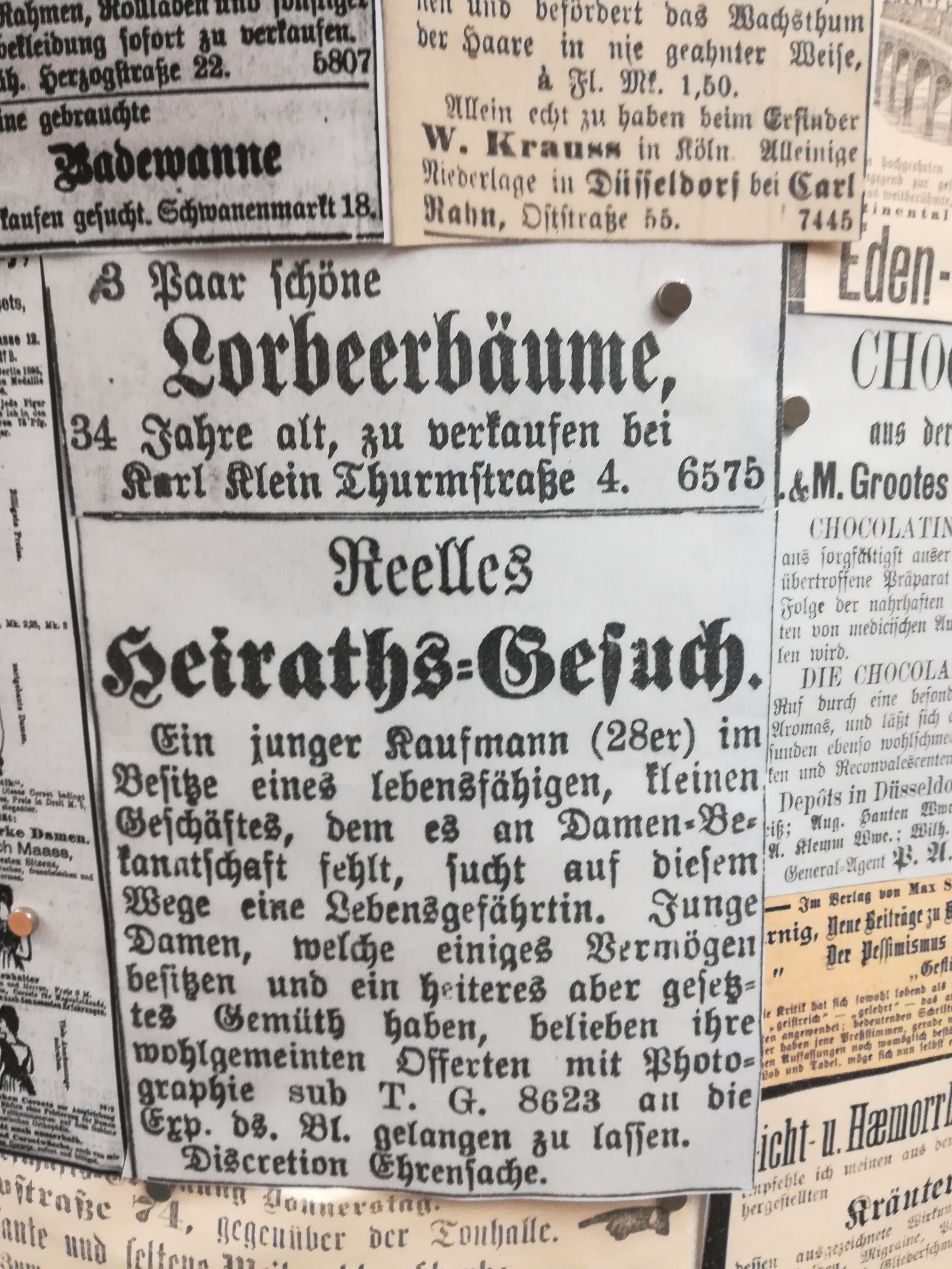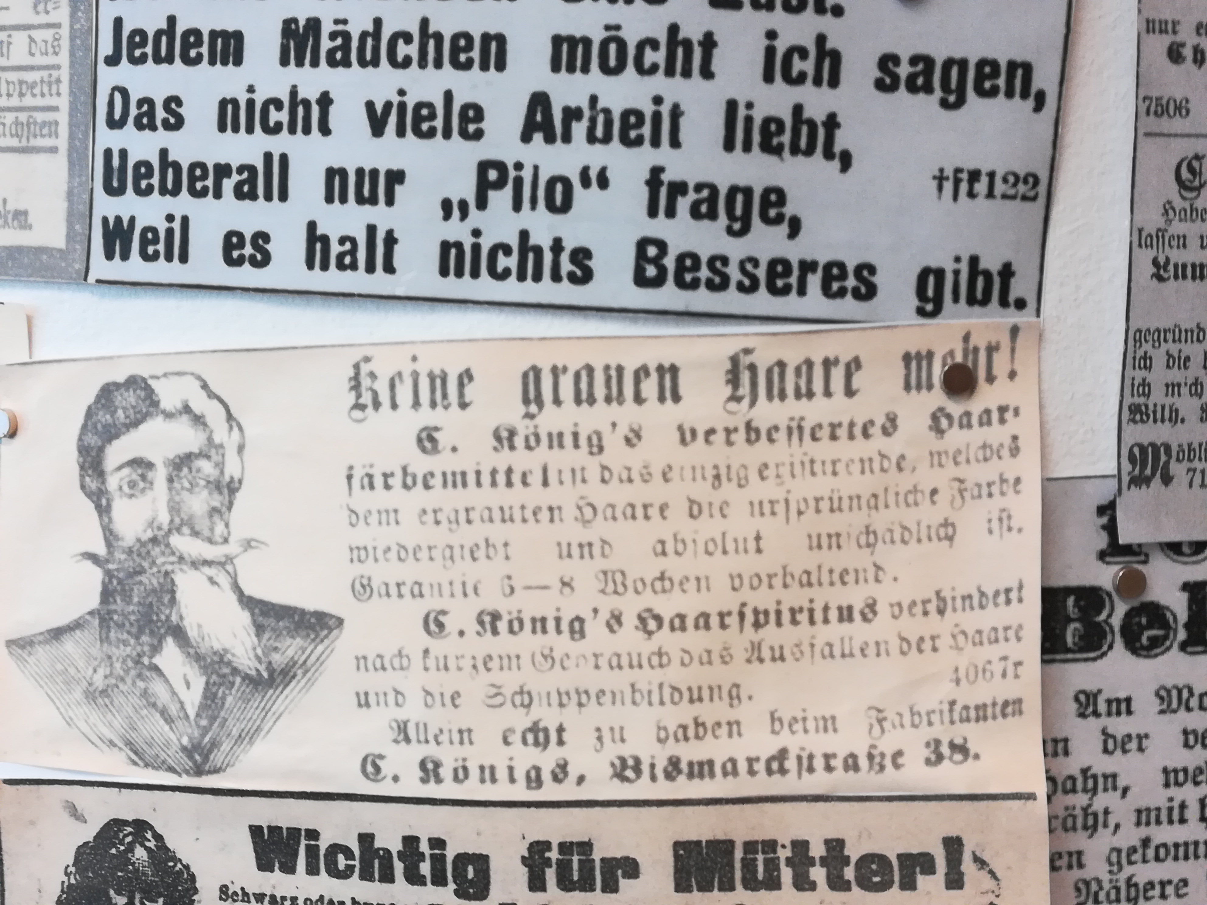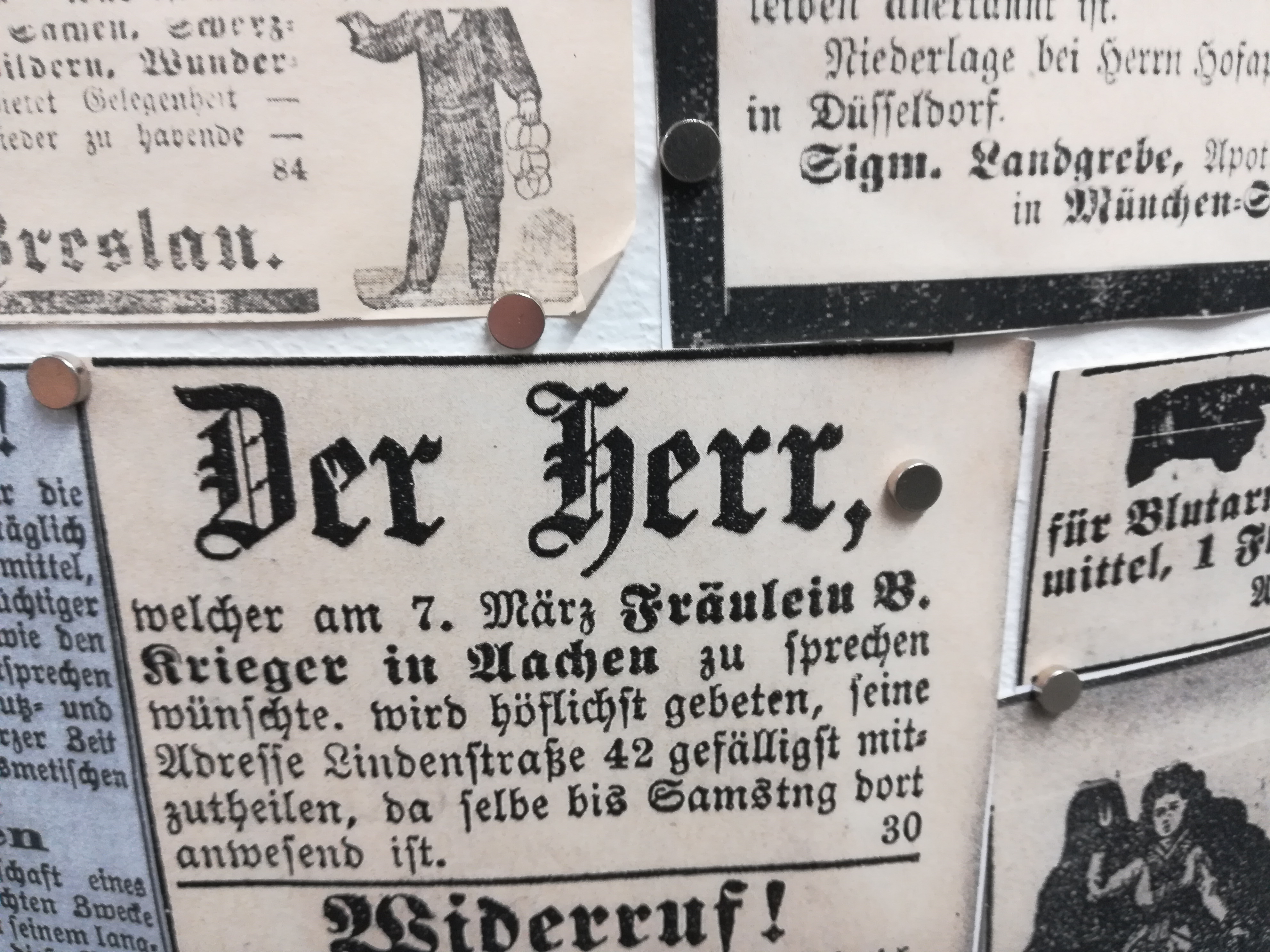 Die Besuche sind allerdings nie umsonst, weil sich mein Blick auch auf andere Dinge richtet, als auf den nüchternen Aktenschrank, in dem die Kirchenbücher lagern. Jedes Mal stehe ich im Lesesaal vor der Litfaßsäule, an der die Zeitungsanzeigen aus dem 19. Jahrhundert gepinnt sind.
