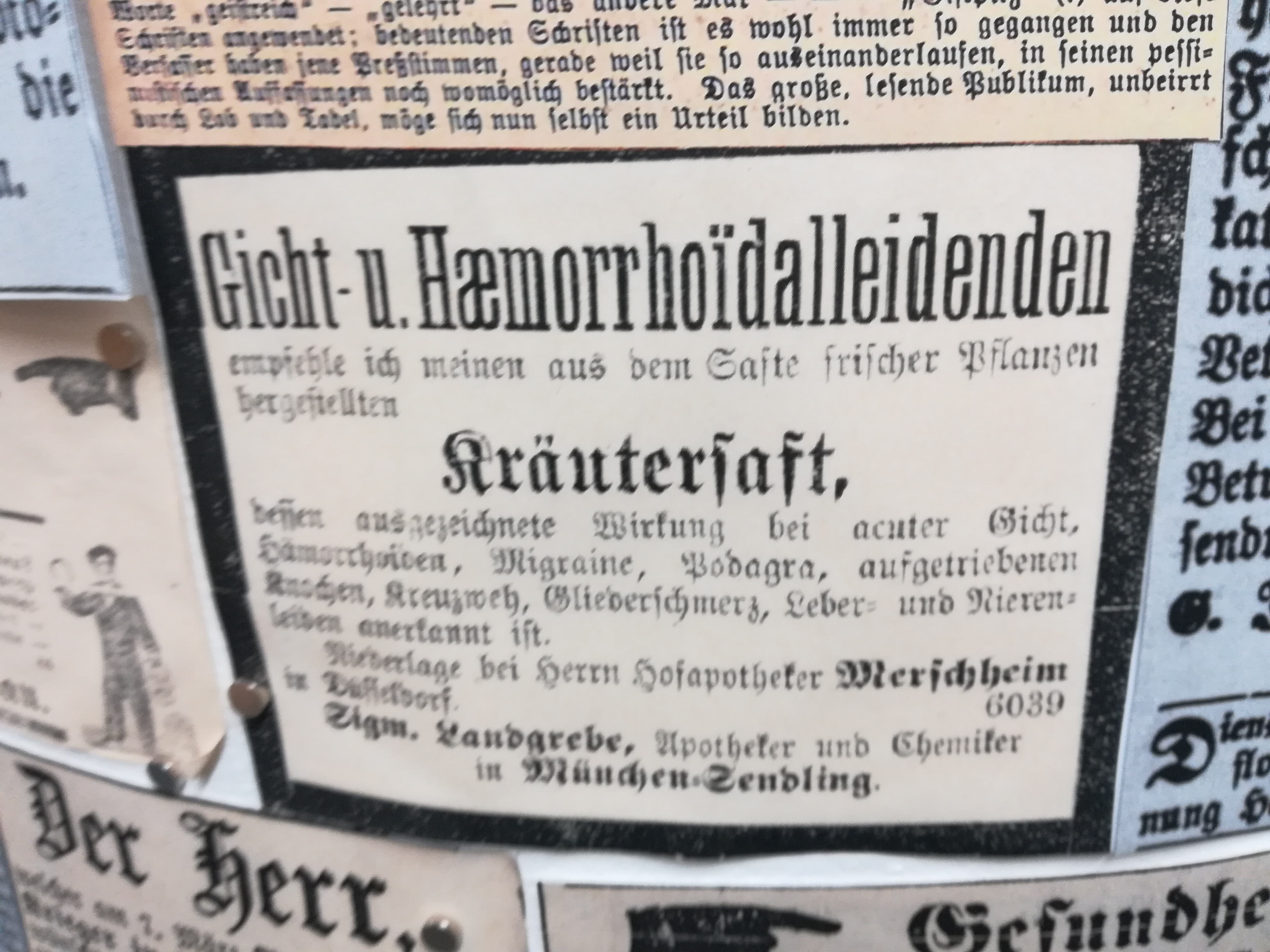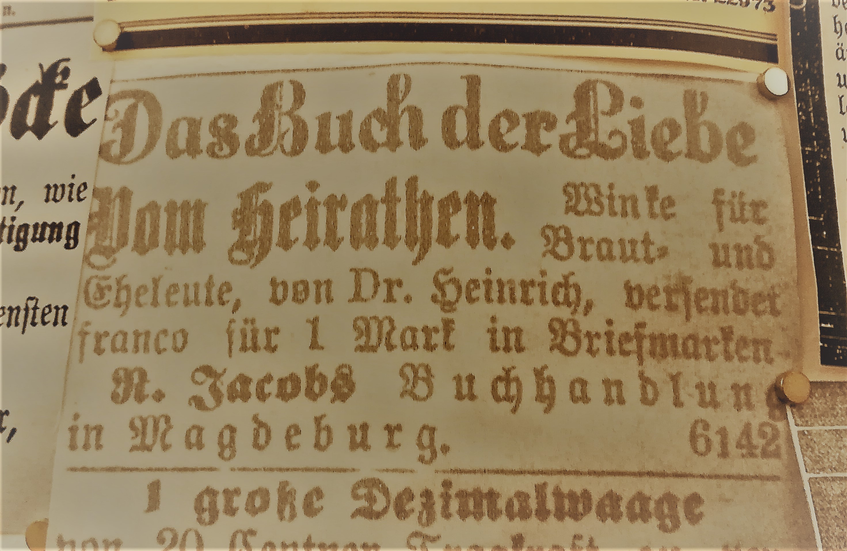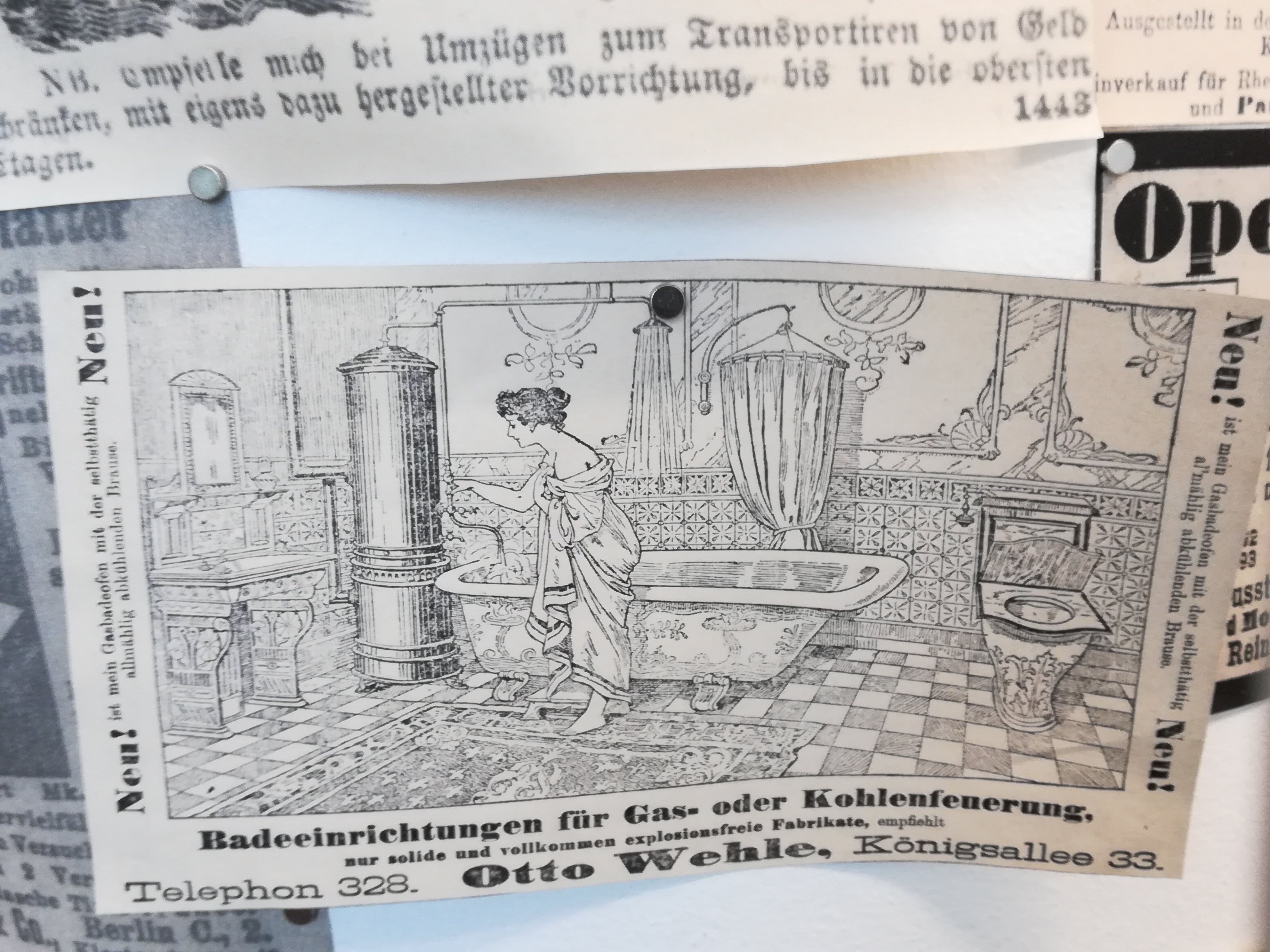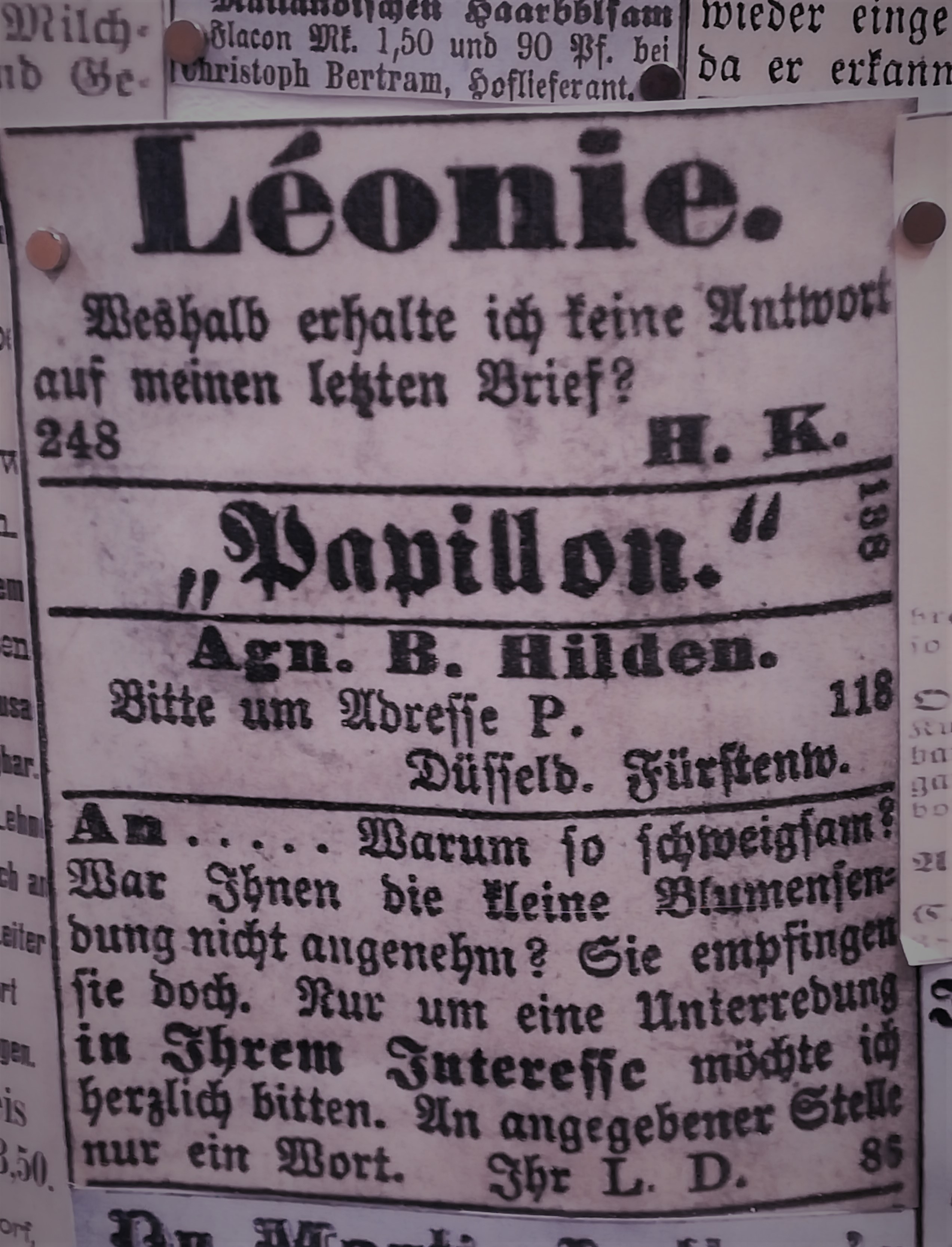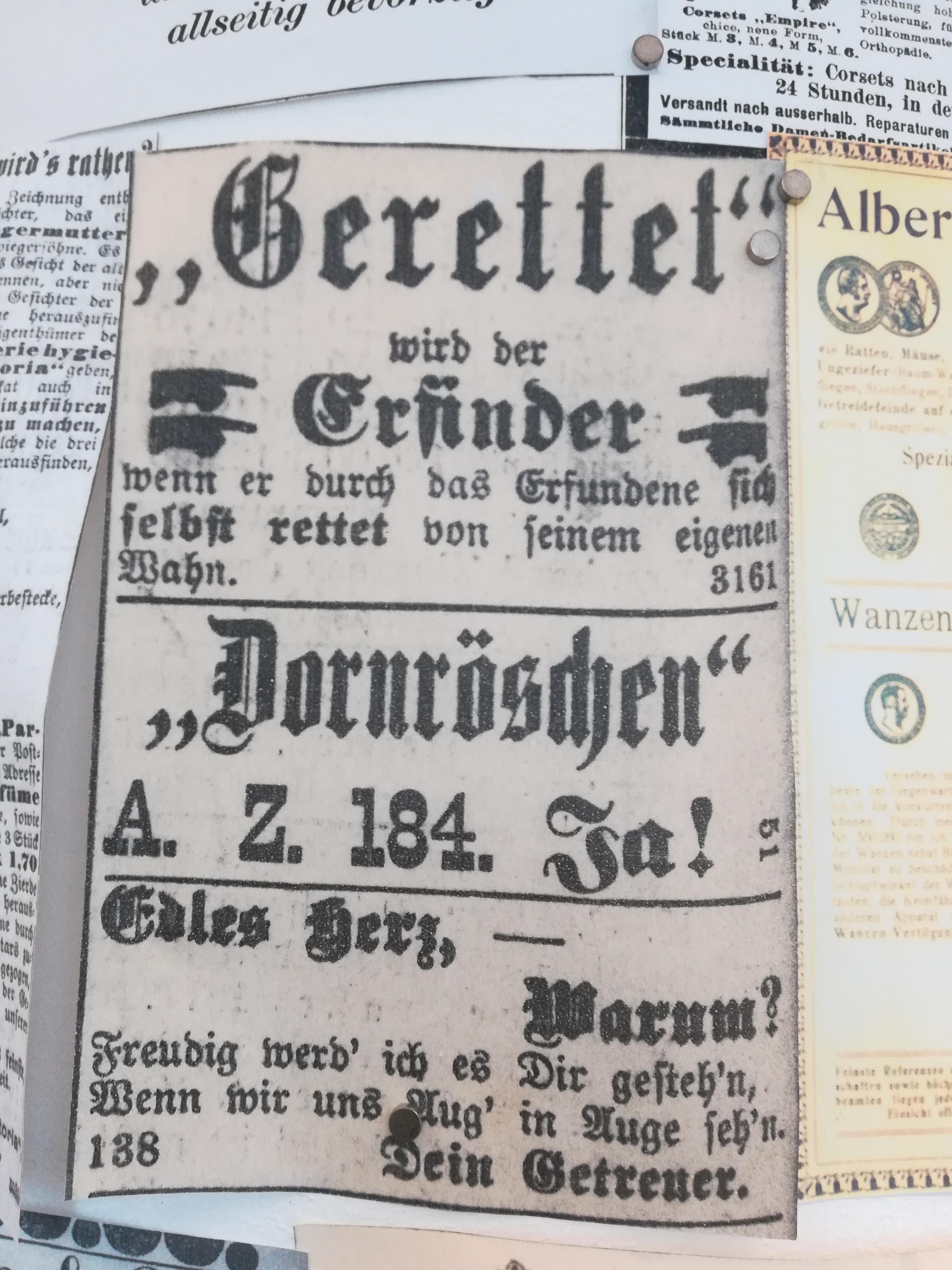 Die Besuche sind allerdings nie umsonst, weil sich mein Blick auch auf andere Dinge richtet, als auf den nüchternen Aktenschrank, in dem die Kirchenbücher lagern. Jedes Mal stehe ich im Lesesaal vor der Litfaßsäule, an der die Zeitungsanzeigen aus dem 19. Jahrhundert gepinnt sind.