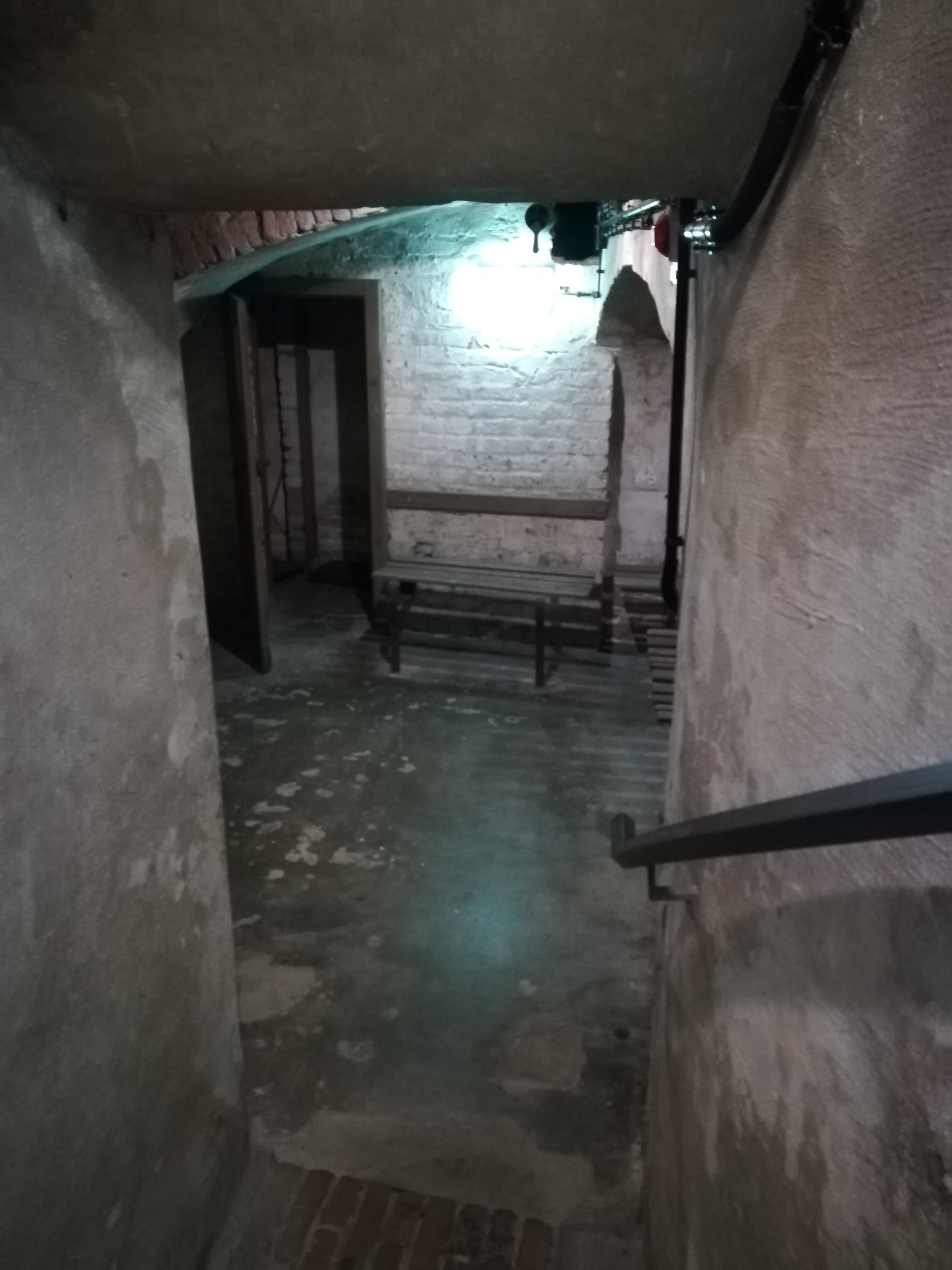 Anders als beim Hochbunker ging es zum Luftschutzkeller über Treppen in die Tiefe, durch Schleusen und schwere Metalltüren. Dort hockten die Menschen wie die Hühner auf der Stange auf Holzbänken und harrten über Stunden in stickigen Räumen aus. Damit ihnen nicht vollständig die Luft ausging, musste ständig frische Luft hineingekurbelt werden, die anschließend über Filter gereinigt wurde.