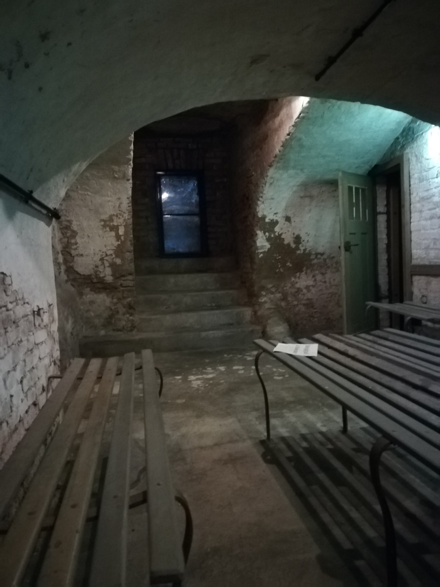 Anders als beim Hochbunker ging es zum Luftschutzkeller über Treppen in die Tiefe, durch Schleusen und schwere Metalltüren. Dort hockten die Menschen wie die Hühner auf der Stange auf Holzbänken und harrten über Stunden in stickigen Räumen aus. Damit ihnen nicht vollständig die Luft ausging, musste ständig frische Luft hineingekurbelt werden, die anschließend über Filter gereinigt wurde.