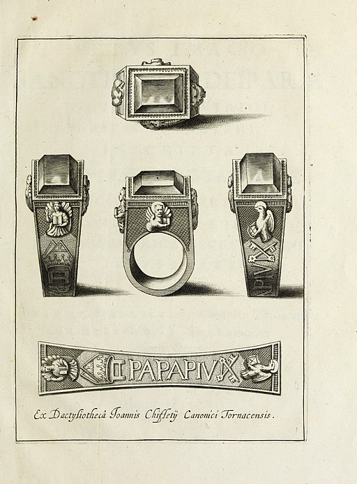 Doch Ringe trug man schon zu Beginn der Bronzezeit. Anhand des Materials war die Macht erkennbar, die Man (n) sich leisten konnte. Ob an Händen, Hals oder Fuß – Ringe wurden an allen Körperteilen getragen. Sie verkörperten nicht nur den momentanen Status für eine bestimmte Person, sondern konnten auf andere übertragen werden. Ein Siegelring zum Beispiel, unterstützt den Träger dieses Stückes in der Ausübung seines Amtes. Der Papst bekommt den Ring des Fischers überreicht. Dieser Ring, auf den das Motiv von Petrus, dem ersten Papst in Gestalt eines Fischers eingraviert ist, gilt als höchstes Siegel für päpstliche Dokumente.