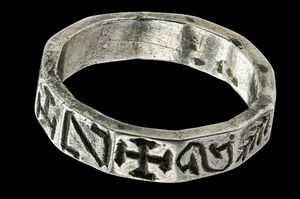 Doch alles, was darüber hinaus ging – Fehlanzeige. Eine Inschrift zierte seine Außenkante; allerdings wirkten die Buchstaben wie wahllos ineinander verflochten. Lediglich Krückenkreuz und Palmwedel waren drauf erkennbar. Mehr als zwei Jahre tüftelten Wissenschaftler verschiedener Gattungen dran, dem Ring sein Geheimnis zu entlocken. Zwei Jahre später gelang mit Hilfe von Epigraphen, Linguisten und Theologen der Durchbruch: Die verklausulierte Inschrift zeugt von der religiösen Hingabe eines Mannes. Denn die auf ein Schreibschnipsel reduzierte Inschrift heißt NAINE MI XPS, was von den Wissenschaftlern als „Verneine mich Christus“ übersetzt und im Sinne von „Vernichte mich Christus“ interpretiert wird.
