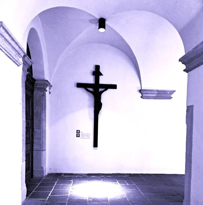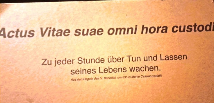 Der Mönch (?), bestattet in einem trapezförmigen Sarg, hielt einen gut erhaltenen Rosenkranz in den gefalteten Händen. Und wenn man zu guter Letzt über seinen Schatten springt und um die Ecke biegt, erscheinen auf Leinwänden, von Scheinwerfern angestrahlt, eine Gruppe von Mönchen. Neugierig geworden tritt der Besucher nach vorne – und wird jäh gestoppt von einer Schranke mit angeschraubtem Schild. Und auf dem steht eine einladende Bestimmung: Actus vitae e suae omni hora custodire. Wem wird das wohl gelingen wird?
