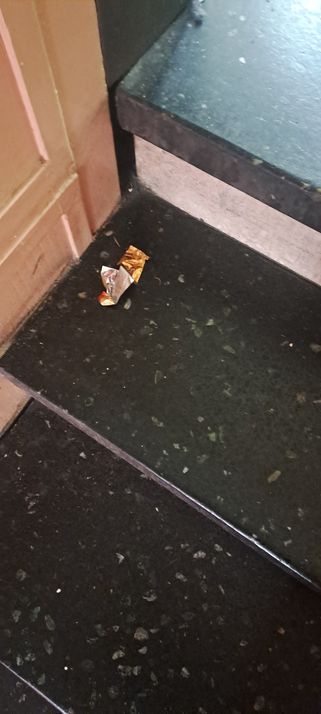 Gestrandet auf den Treppenstufen mit Schokoriegel
