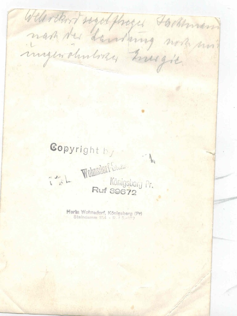 Diese Fotos sind weitaus professioneller als die üblichen Bilder, die mit der privaten Kamera aufgenommen wurden und lassen den Pressefotografen vermuten. Wenn man diese großformatigen Fotos umdreht, fällt einem der Stempel des Fotoateliers sofort ins Auge. Mit Copyright by Wohnsdorf- Steindamm 154 Königsberg Pr. hat jemand, vermutlich der Fotograf, sein Brandzeichen auf dem Barytpapier hinterlassen. Sogar eine Nummer ist beigefügt und fast bin ich gewillt, die Vorwahl Königsberg zu suchen und das Atelier unter der 39672 anzurufen, bis eine Sekunde später auffällt, dass weder der Ort, noch das Atelier, geschweige denn der Anschluss in dieser Form noch existiert. Ein kleiner Stempel darunter gibt Auskunft darüber, dass es sich bei dem Fotografen um eine Frau handelt: Hertha Wohnsdorf. Unwillkürlich werde ich neugierig, gebe Name und Adresse in Google ein und stelle fest, dass das Netz Erstaunliches zu Tage befördert.